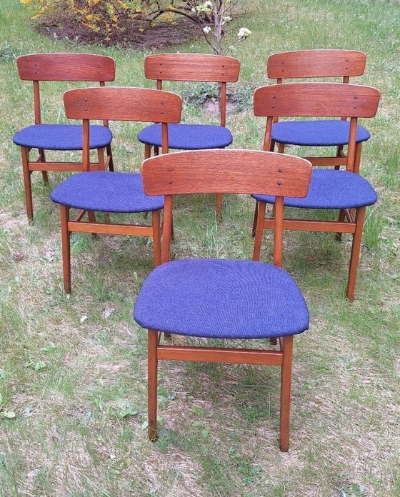Finely constructed set of Danish teak and beech dining chairs by Farstrup, the seats re-covered with navy blue structured fabric similar to 1960s fabrics.