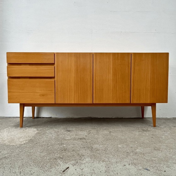 The two drawers and a cabinet on the left and the three doors on the right offer ample storage space, while the slender, tapered legs give the whole piece a sense of lightness and refinement. This is a piece that brings tranquility to the room without sacrificing strength. GE-EL Möbel was known for its solid construction and timeless designs, and you can feel that in every detail here. A rare piece that combines German precision and natural beauty in a stylish statement.