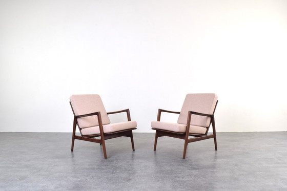 The frame of the armchairs is made of solid beech and has been professionally and carefully restored by removing the old coatings, staining, and finishing in varnish. The restoration was carried out by a talented and experienced carpenter with over 20 years of experience. The seat and backrest cushions have been reupholstered in a beige-powder-pink recycled wool fabric. Thanks to this treatment, the chairs look beautiful and will serve their new owner for many years without fear of damage or wear and tear from everyday use.