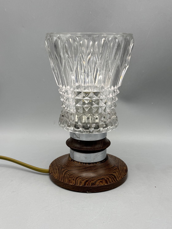 Stylish mid-century table lamp with a distinctive look and warm ambiance. This elegant vintage lamp combines a beautifully cut glass shade with a solid wood-grain base and metal accents, typical of mid-twentieth-century design.