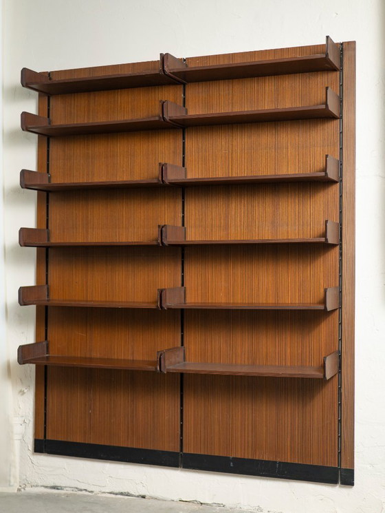 Looking at this generous wall unit, it becomes clear that they don't make'em like they used to. Done in teak and veneer, this piece's tasteful ornamentation is restricted to the tips of its 12 adjustable shelves, resolved in an elongated pyramid shape. The rest is left to the materials' natural beauty, so that this piece only ends up providing a pleasant background to the objects it holds. One can place the shelves anywhere along the black metal rails, according to their needs and wants. Due to the simplicity and flexibility of this system, changing one's mind is hardly an issue.