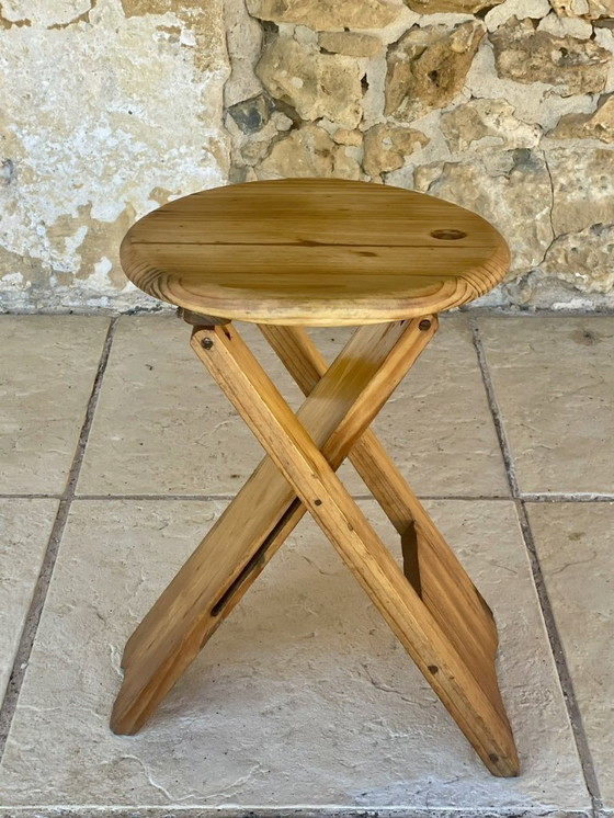 Mid-century, TS folding stool designed Roger Tallon for Sentou, 1970s. This is a classic design and original piece, not to be confused with some other, later versions made by Adrian Reed, like the "Suzy stool." This version is the most desirable, as it is the one made of Marine Pine, aka "Pin Maritime des Landes", in Southwest France. Older versions of the stool, like this one, have wooden folding mechanisms, and 2 pieces of wood under the seat, versus more recent models, that have a plastic folding system, with no additional pieces of wood under the seat. The edging of early versions, also have a bowed ending, on both sides. Stool has been purchased directly from its original (1st) owner, in the village where the Sentou factory was established, and it was bought straight from said factory, about fifty years ago, and up until now, was still in use. Piece is in overall good, original and vintage condition with some marks, dents, areas of faded color, signs of age and previous use commensurate with time, as well as a patina of time (see photos.). Some small chips at the edging of the legs (see photos.) It looks as though some old repairs may have been done throughout time. The folding mechanisms are functional (see photos.). Stool has only been cleaned, oiled, waxed and polished with respect to the original patina.
