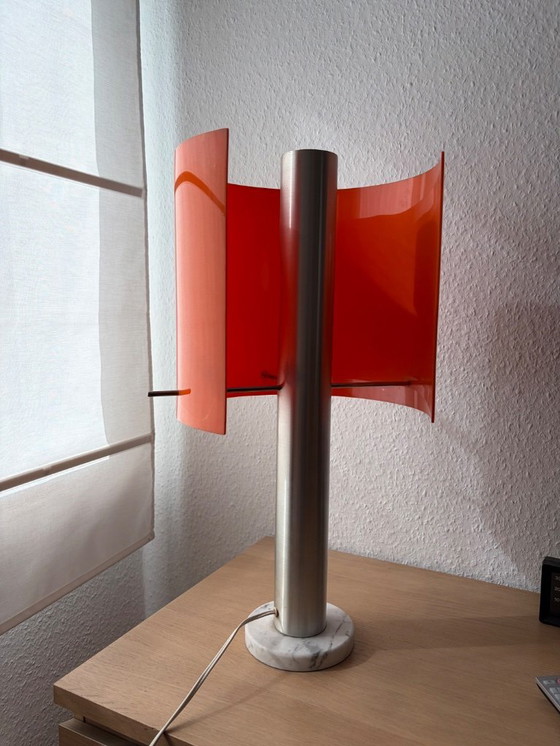 The design features a central metal tube with curved orange plexiglass panels. The lamp stands on a solid marble base.