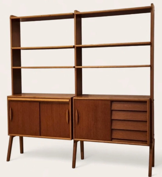 Beautiful Swedish mid-century vintage wall system from the 1960s with a characteristic Scandinavian look. The sleek, well-thought-out design combined with high-quality light oak veneer creates a timeless and light look. The elegantly shaped wooden handles and wooden legs add class and refinement.