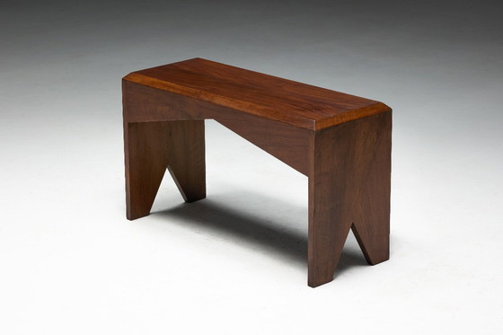 This handcrafted solid walnut bench features clean architectural lines, beveled edges, and unique V-cut legs. The warm walnut grain adds natural depth and character, making it perfect as an entryway seat, hallway accent, or stylish end-of-bed bench. Its compact size and versatile design allow it to seamlessly complement rustic interiors, mid-century modern settings or modern interiors.