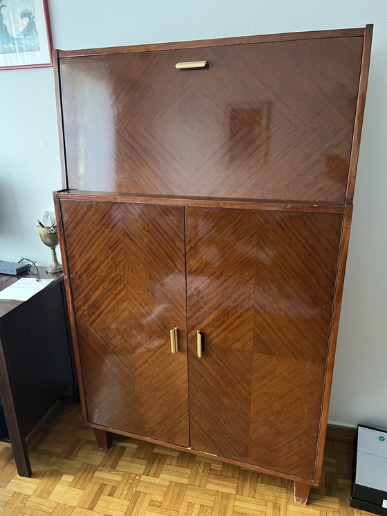 Beautiful vintage cupboard with elegant veneer pattern and brass handles. Used but nice overall condition. Some scratches and signs of use (see photos for details), consistent with age. Sturdy, functional, doors open and close well.