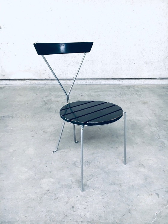 Vintage Midcentury Modern Slender Design Chair, Italy 1970's. No maker markings. Black laquered wood seat and back rest on chrome metal slender construction. Solid design in very good condition. Measures 85cm x 42cm x 50cm.