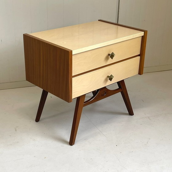 Cool designed vintage nightstand ! It stands on high sloping teak legs and has 2 smooth-running drawers. The sides are made of teak veneer and the rest of blond ash veneer. It has brass knobs. Is in nice and solid condition with only light traces of use. The top has some stains.