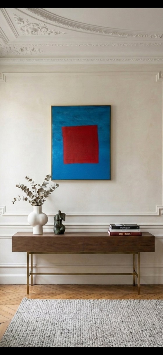 The work features a vibrant red rectangle suspended against a textured azure blue background, creating a powerful chromatic contrast and remarkable visual depth. This mature piece integrates perfectly into a contemporary, minimalist, or mid-century modern interior.