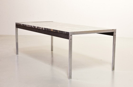This minimalistic rectangle black marble coffee table is part of the 020 series designed by Kho Liangh Ie for Artifort. Its exclusive design is in style of the coffee table model PK63 by Poul Kjaerholm. The beautiful table top features white and rose dramatic tones in the black marble and rests in a refined brushed steel base. It was produced in the Netherlands in the 1960s. This excellent coffee table is in a very well preserved vintage condition, with minor wear consistent with its age and use. Dimensions: Height: 38 cm, Width: 112 cm, Depth: 50 cm.