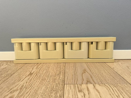 Made of molded plastic, it features fold-out hooks and a typical Space Age style. Functional and compact, it's now a classic of vintage Italian design.