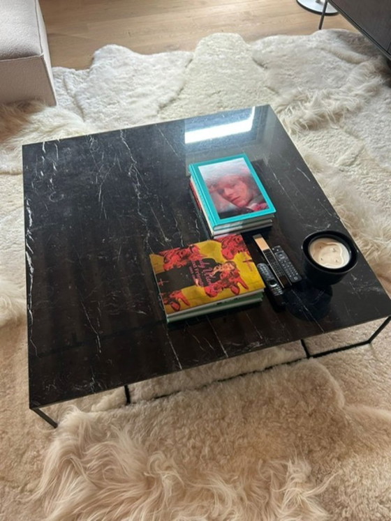 This elegant Minotti coffee table, crafted from high-quality black marble, adds a touch of sophistication to any living room. The table exudes a modern aesthetic with its clean lines and minimalist design, fitting perfectly into a contemporary interior.