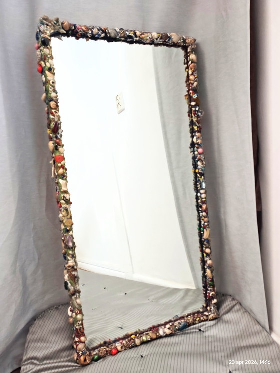 Bring a touch of the sea to your interior with this unique mirror featuring a shell border. Perfect for a beach house or simply to bring a bit of a holiday feeling into your home. The border is richly decorated with a colorful collection of shells and small decorative elements, including ivory, giving it a playful and artistic look. Hang this mirror in your hallway, living room, or bathroom for an instant eye-catcher that brightens up your space and adds a personal touch.