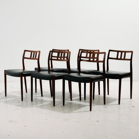 Completely restored ‘Model 79’ teak dining chair with fresh leather upholstery. Designed by Niels Otto Møller for J. L. Møllers Møbelfabrik in the 1960s. The sculptural details of the backrest with its beautiful joints create an excellent combination of comfort and simplicity.