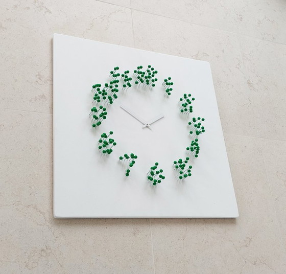 Unconventional designer clock designed by JAN PAUL. Standing directly in front of the clock, you can clearly read the numbers and the time. As you walk around the clock, the numbers appear to disintegrate into floating white spheres. Unique design, handmade by the designer. Exhibition model in mint condition.