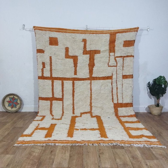 Bring warmth and a modern, artistic touch to your interior with this beautiful handmade Berber rug from Morocco. The striking abstract design with warm terracotta/orange lines on a soft natural wool background creates a powerful and stylish statement that fits perfectly into modern, boho, and minimalist interiors.