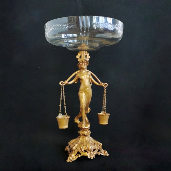 A beautiful modernist centerpiece in gilded calamine, it retains its original glass in which you can appreciate the beautiful bubbles produced by the hand-blown technique, revealing its age. It is in perfect condition, except for a small, barely perceptible chip on the glass (see last photo).