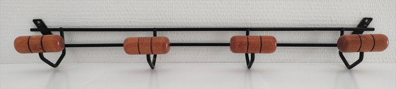 Modernist design wall-mounted coat rack in black lacquered metal with four varnished wooden hooks. French work from the 1960s. Good overall condition. Minor signs of wear in places (paint chips at the screw points and paint wear at friction points – see photos and zoom). Total length 62 cm.