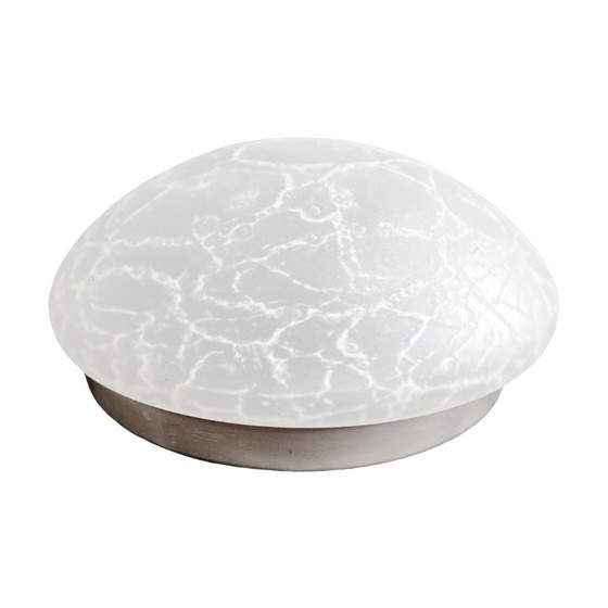 This model features a distinctive mid-century modern style. The lamp features a hemispherical shade made of thick craquelé glass (with a fine cracked and marbled effect) mounted on a satin-finished metal base.