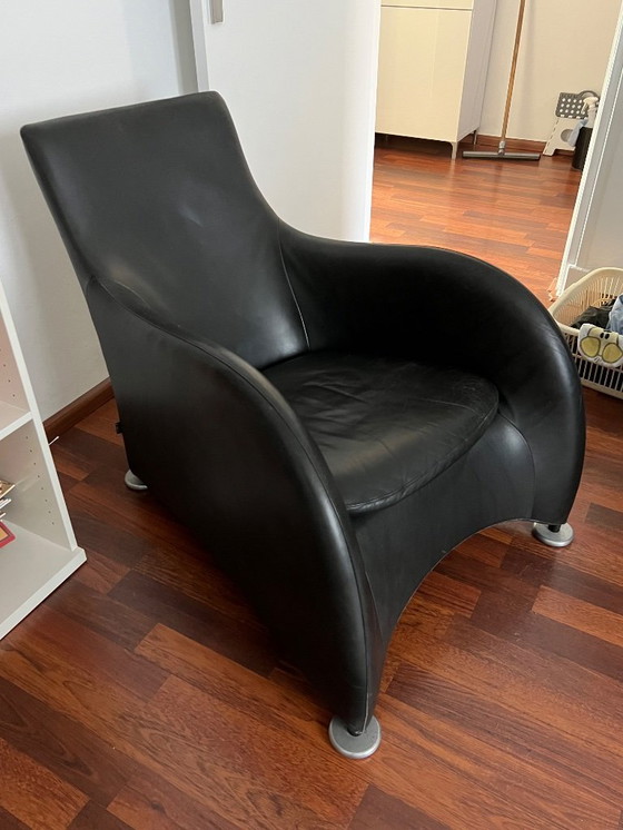The Montis Loge, an armchair that combines luxury and comfort. Its shape makes it perfect for relaxing. This chair is upholstered in black leather.