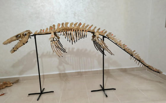 Step back in time with this magnificent Mosasaurus display specimen, a striking representation of one of the Cretaceous period's most formidable marine predators. Measuring an impressive 280 cm in length and 50 cm in width, this piece has been expertly restored to 90% of its original glory, offering a breathtaking glimpse into prehistoric life.