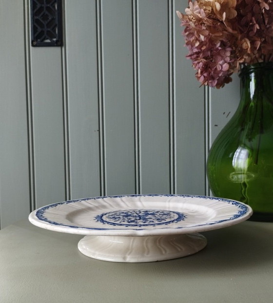 A footed plate, a low compote dish, or a cake stand, decorated with a pretty navy blue arabesque transfer.