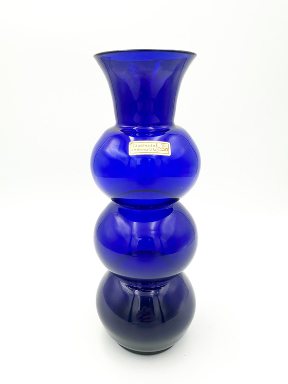 This mouth-blown glass vase was made by the glass company Glashütte Rheinpfalz in the 1960s in Germany. The vase is blue and consists of three round spheres and a trumpet-shaped opening. With original sticker. Is in excellent condition.