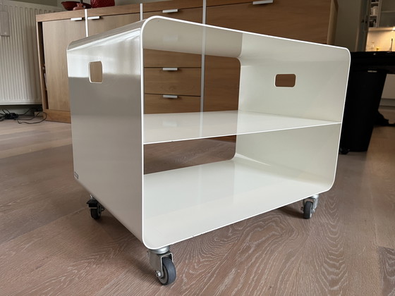 This Muller rolling cabinet is a sleek and modern storage unit perfect for any contemporary space. It features a minimalist design with a white metal finish and is equipped with casters for easy mobility. The cabinet offers plenty of storage space with its open shelves, making it both functional and stylish. Ideal for use in offices, living rooms or bedrooms, this piece of furniture combines functionality with a sleek aesthetic.