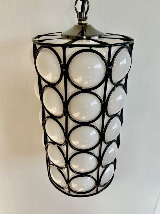 Murano opaline glass lamp from the late 1960s. The design features a distinctive "bubble" or "cage" effect, where a blown white opaline glass diffuser is enclosed in a geometric black metal frame with circular motifs. This unique process creates a textural and visual contrast typical of the Mid-Century Modern aesthetic.