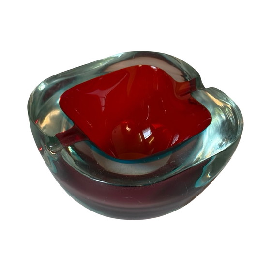 Murano glass ashtray made from red and blue glass and shaped like a geode. Vibrant colors and two slots for either a cigarette or cigar. A heavy piece that has other uses as well and would be a great start or addition to any collection.