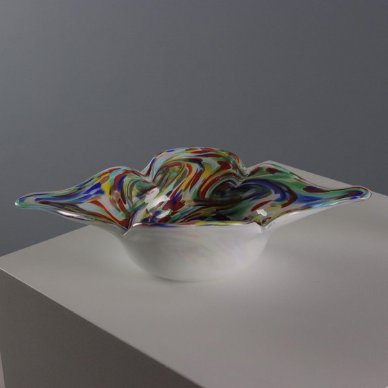 Elongated centerpiece in white cased and submerged glass, with multi-colored and gold inclusion decorations.