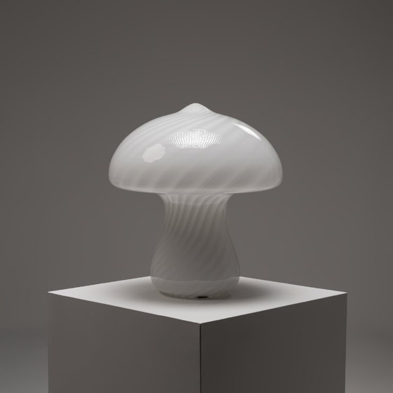 This charming Murano glass table lamp in the shape of a mushroom is a beautiful example of Italian glass art. The gently curved shade and subtly curved base create the classic mushroom silhouette, crafted from opal glass with delicate spiral patterns that add subtle movement and depth.