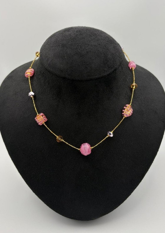An elegant necklace crafted from authentic, handcrafted Murano glass, embellished with exquisite pink beads with gold leaf inserts. Each glass element is unique and features delicate internal workmanship that reflects the tradition of historic Venetian glassmaking.