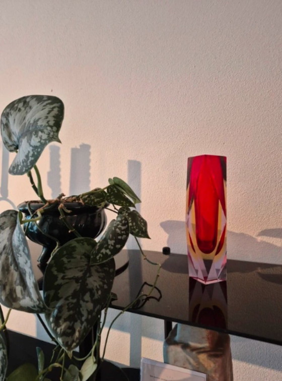 Discover the timeless elegance of this beautiful Murano glass vase, an iconic piece that adds a touch of mid-century modernism to your interior. With its two-tone design in vibrant red and yellow, this vase catches the light in a way that enlivens any space.