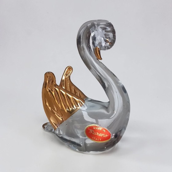 Hand-blown Murano glass swan in transparent glass with gold-colored wings and beak. Features original “Made in Murano Italy” sticker.