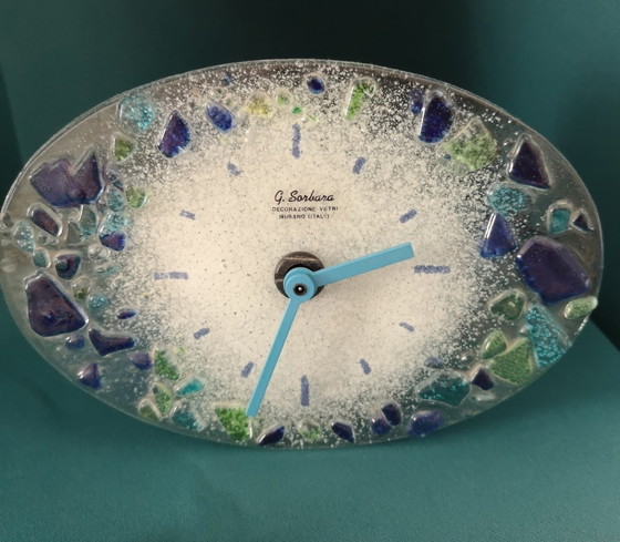 This beautiful Murano glass clock by G. Sorbara is a real vintage piece. It impresses with its unique design with colorful glass elements in blue and green, which are artfully incorporated into the transparent glass. The clock is a decorative highlight and a must-have for lovers of Murano glass and vintage designs. Perfect for any stylish home or as a special gift.