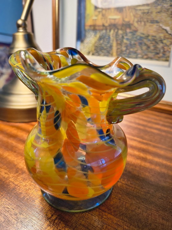 The mouth-blown glass is designed as a small jug and features characteristic confetti patterns.