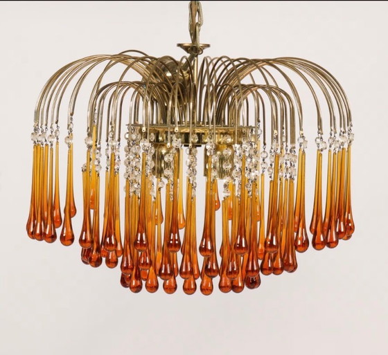 Illuminate your space with the exquisite elegance of this Murano tear drop chandelier, a stunning piece from the 1970s. This chandelier captures the essence of vintage sophistication, featuring cascading Murano glass drops in a warm amber hue, beautifully complemented by a gold-toned metal frame.