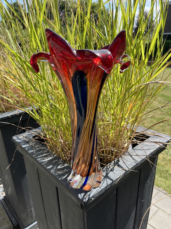 Experience the allure of Italian craftsmanship with this stunning Murano glass vase. Its vibrant red, blue, and orange hues swirl together in a captivating dance, embodying the elegance of Art Nouveau design. This vase is more than just a vessel; it's a statement piece that adds a touch of luxury to any room.