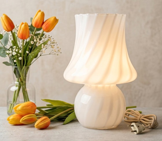 For sale is a splendid designer lamp from the 1980s, an icon of mid-century lighting. Characterized by its iconic mushroom shape, this lamp is crafted from fine milky white blown glass with a spiral ribbed finish (an optical effect).