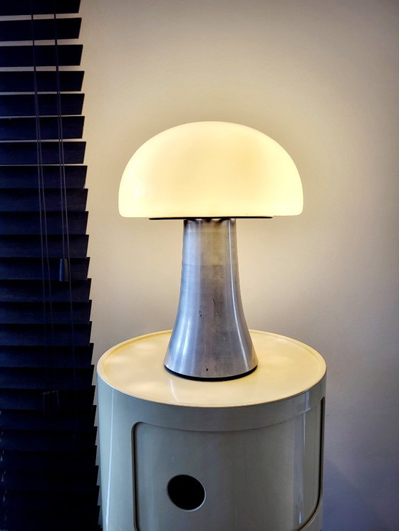 This stylish mushroom lamp is designed from stainless steel and weighted with cast iron, making it durable and giving it a stylish look. The lampshade is made of matte white glass. Presumably from the 1980s.