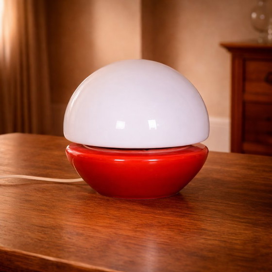 A compact mid-century table lamp with a bold mushroom silhouette and strong visual contrast. The combination of opaline glass and colored base creates a soft, diffused light effect.