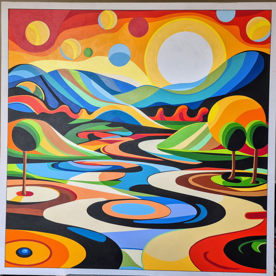 This artwork, titled "Mysteryland," is a vibrant and colorful abstract painting. It depicts an imaginative landscape with flowing lines and dynamic shapes, exuding a sense of movement and energy. Its rich colors and playful composition make it a striking piece that can brighten up any space. Perfect for lovers of modern and abstract art. It was created by Dutch artist Franklin van Dam. Franklin studied at the Royal Academy of Art and Design and is best known for his colorful and detailed works in a wide variety. The colors in the images may differ slightly from reality.