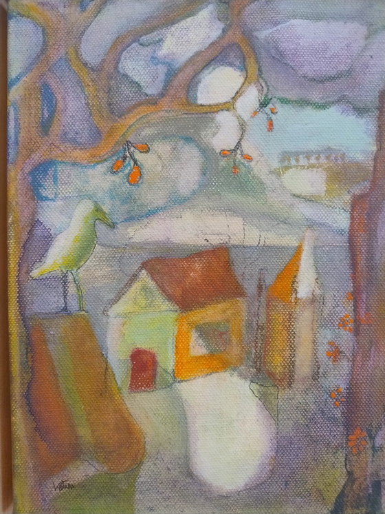 Discover the enchanting world of "Fable Bird," a beautiful abstract painting that sparks the imagination. This artwork captures the essence of a dreamlike world centered around a fabulous bird, surrounded by a vibrant landscape of colors and shapes.
