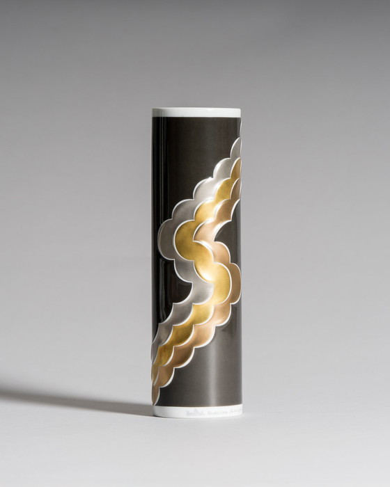 A striking example of mid-century German porcelain artistry, this cylindrical vase by Natale Sapone for Rosenthal's avant-garde *Studio Line* channels a refined drama through its color palette and composition. Against a deep black ground, cascading abstract ornamentation in silver, gold, and copper metallics creates a dynamic visual rhythm — gestural yet controlled, spontaneous yet deeply intentional.