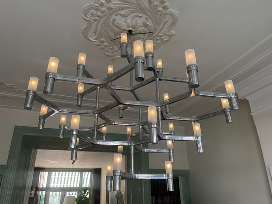 The chandelier is made of cast aluminum and the diffusers are made of sandblasted glass. The 30 upward-facing light sources are mounted on the aluminum structure in five levels of three, six, 12, six and three bulbs, respectively. The chandelier is dimmable has a width of 113 centimeters, a depth of 109 centimeters and a height of 82 centimeters. The steel-reinforced cord is transparent and has a length of 90 centimeters.