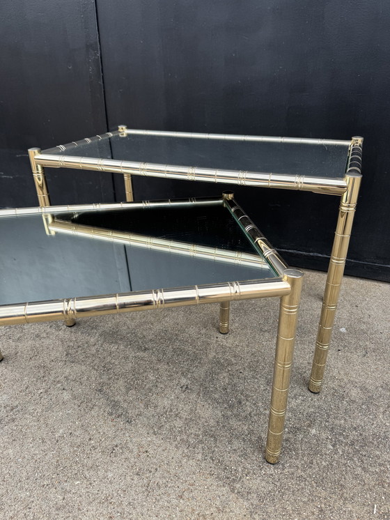 Elegant set of two nesting tables from the 1970s in gold/champagne chrome-plated metal with a bamboo-like finish and mirrored tops; very good overall condition (a tiny chip on one mirror and minor scratches from use: see photo)