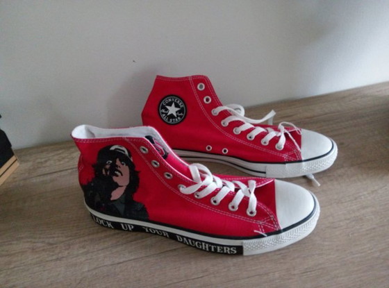 These NEW Converse Chuck Taylor All Stars Hi are part of AC/DC's 2008 "Lock up Your Music" edition and are a must-have for any rock fan. The main feature of these shoes is the writing on the sole "Lock up your daughters" and a design with the face on the outside.