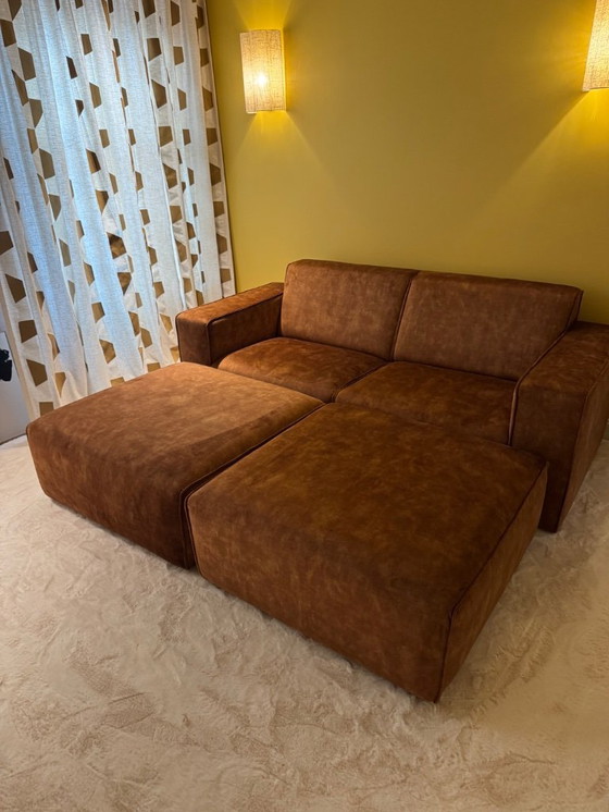 New Sevn Elise sofa with 2 hockers. Upholstery: Thalys Camel 13. Dimensions: 3-seater (216x98 cm) + 2 hockers (98x98 cm each). Never used, unfortunately the model and color does not fit our interior. New price was €2097.