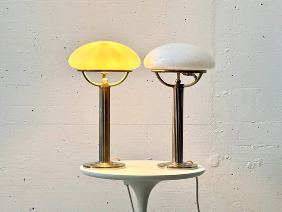 Condition: Both lamps are in very good condition. The metal parts show only a light, age-appropriate patina on the surface, but no major scratches or discoloration. The opal glass shade is undamaged, evenly translucent, and without cracks or chips. Both lamps function perfectly and emit a pleasant light.